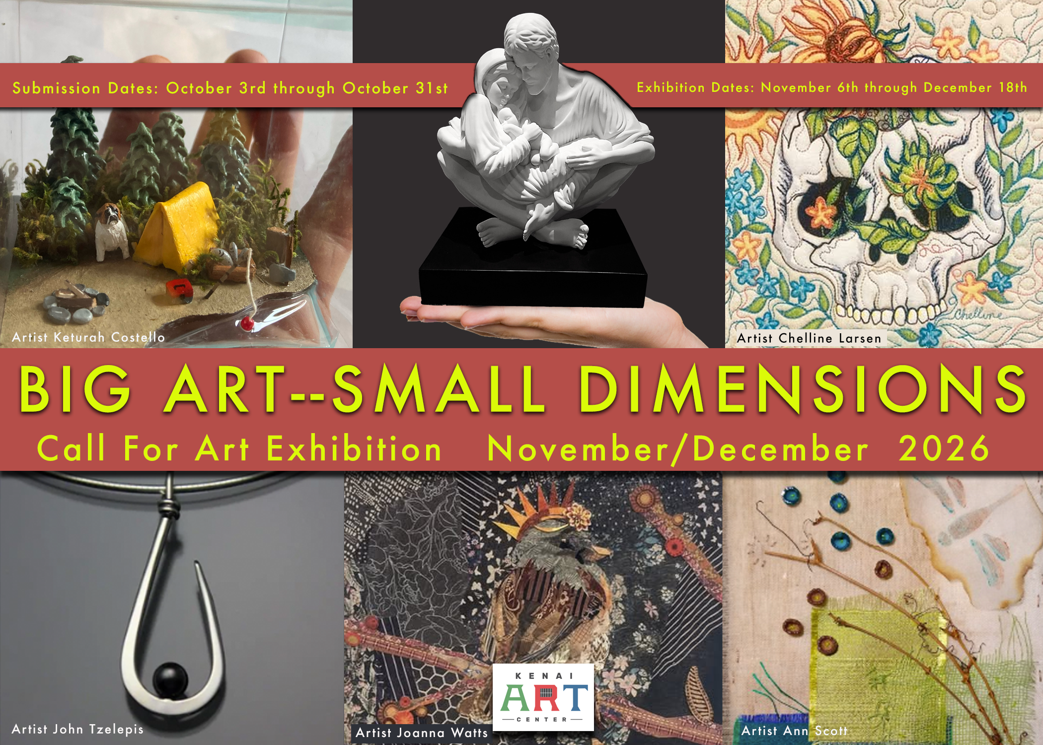 Call Summary: We invite artists 18 ages to 100+ to submit original artwork for our upcoming BIG ART–SMALL DIMENSIONS (12x12x12) Nov–Dec Exhibition. The goal is to celebrate creativity within a smaller, uniform, format. This is an open-theme show.  For Specific show details please visit: https://kenaiartcenter.org/wp-content/uploads/2026/04/12x12X12-Call-For-Art-Show-Prospectus.pdf