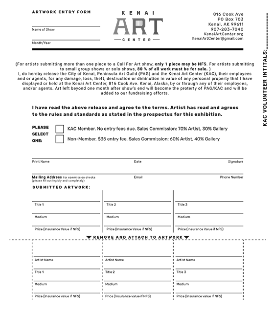 For questions or more info: kenaiartcenter@gmail.com (attention: Charlotte in the subject line please)