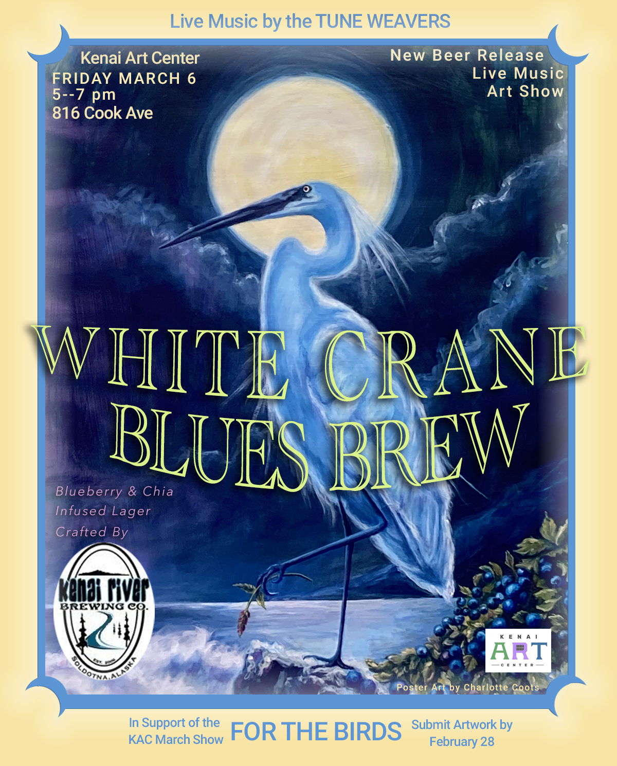 The KAC, the Kenai River Brewing Company and the Tune Weavers will be getting together for this MARCH 2026 call-for-art show and beer launch fundraiser titled FOR THE BIRDS. Live music and a locally brewed blueberry and chia inspired lager will be on offer at this bird themed fundraiser.