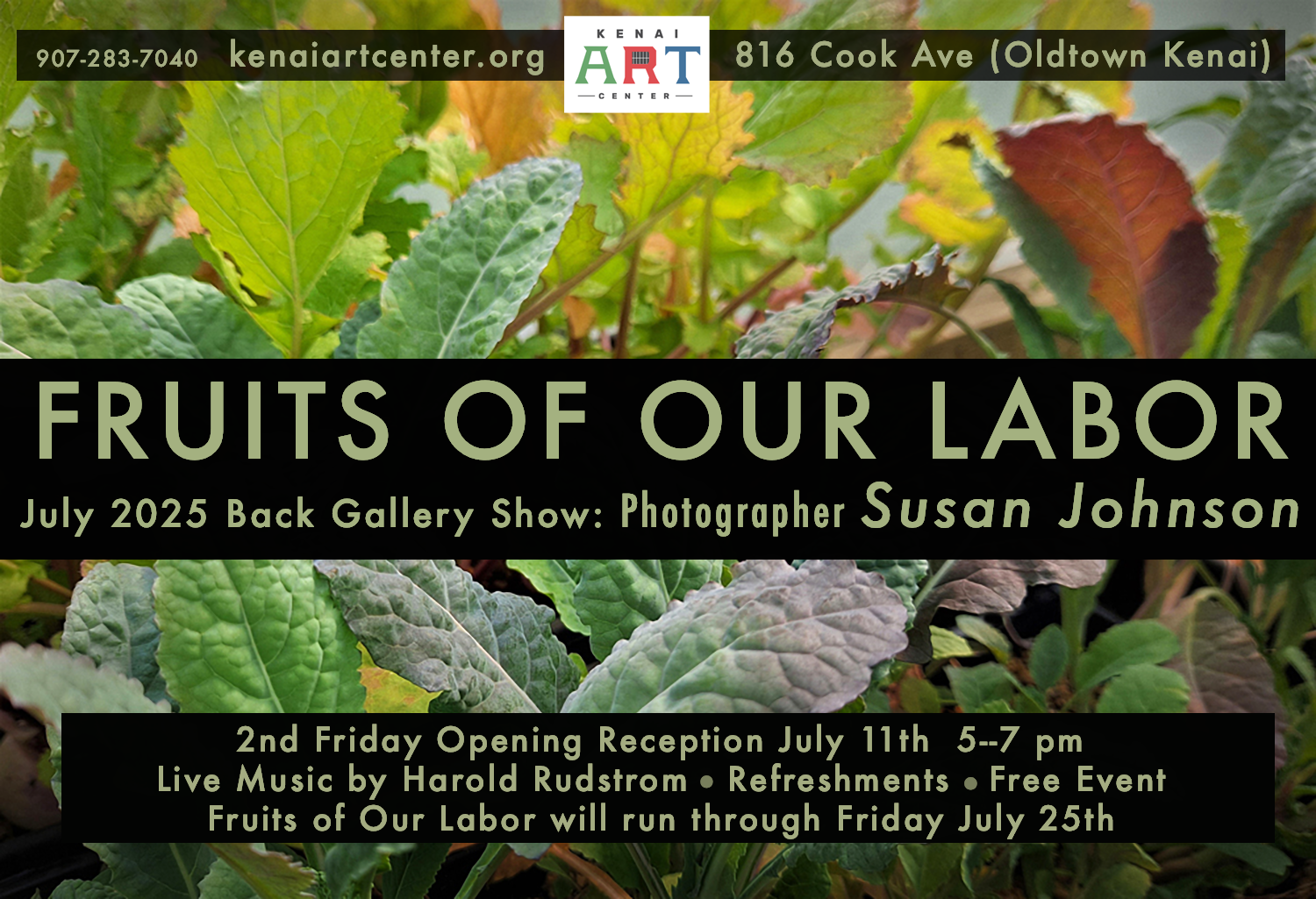 Join us in the back gallery in July for the show FRUITS OF OUR LABOR featuring photography by Susan Johnson. Because of the 4th of July holiday, our show will open on the 2nd Friday on July 11th 5–7 pm. Live Music by Harold Rudstrom.  We will have refreshments at this free event. Public is welcome! This show will run through Friday July 25th.