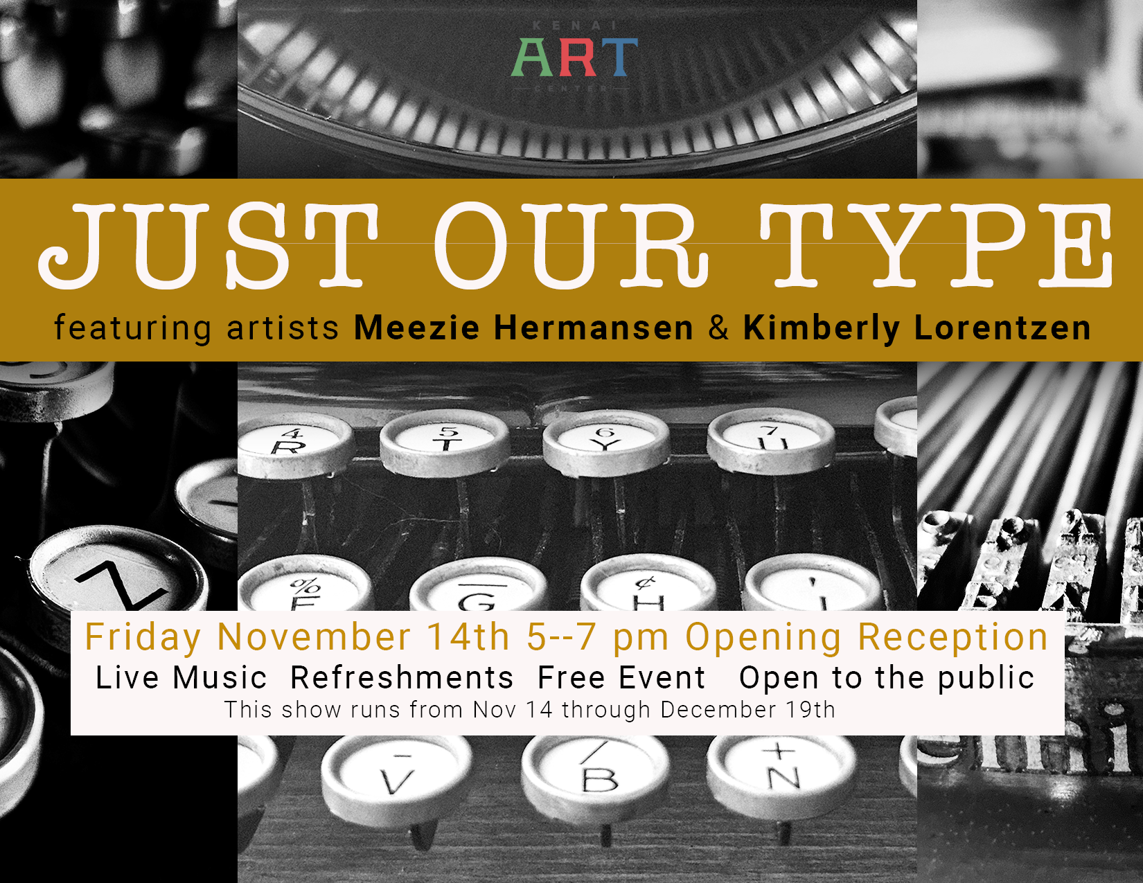 Meezie Hermansen and Kimberly Lorentzen will bring this interactive show to the KAC and in their words this exhibit is “intended to celebrate the written word and the themes of human experience in our community. We are together, just our type of community…There is currently, world-wide, a resurgence of appreciation for the beauty of the manual typewriter as an elegant machine and of the physical experience of using it in a world that has become increasingly digital and virtual.”