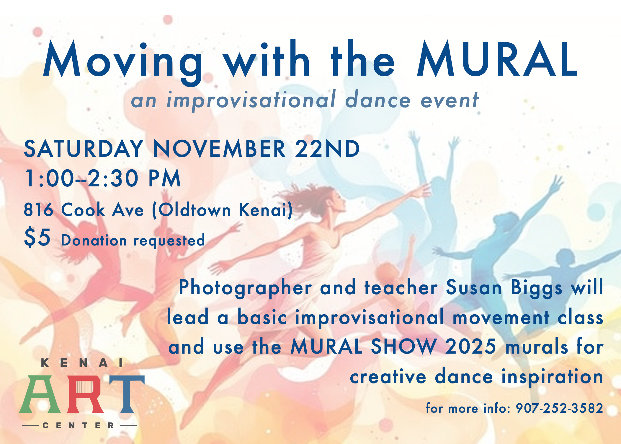 Photographer and teacher Susan Biggs will be teaching basic improvisational movement and then the participants will use the surrounding murals as inspiration for creative dance.