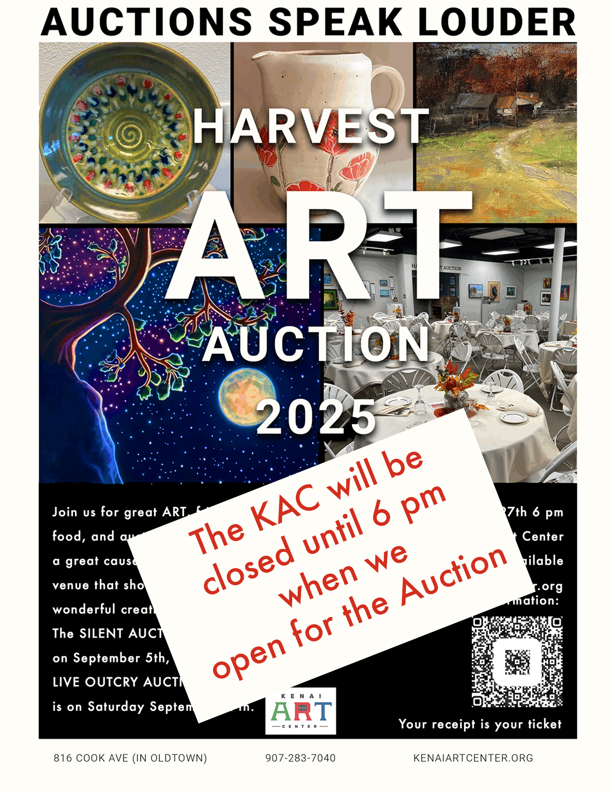 The KAC will be opening later than usual on Saturday the 27th due to preparations for the Harvest Art Auction which will open at 6 pm. There are still tickets available, so get them here online: https://checkout.square.site/merchant/442TPNHGRFBQ4/checkout/XUTMH3M3RQBC23IPP7CJITUI?src=webqr or stop by the KAC and get tickets before they are gone. We have 50 seats total.